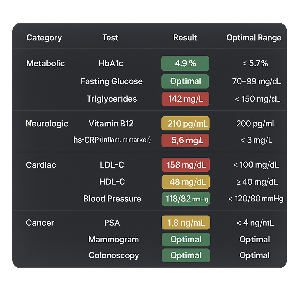 Monitor key health markers across cardiac, metabolic, cancer, and neurologic categories with ease.